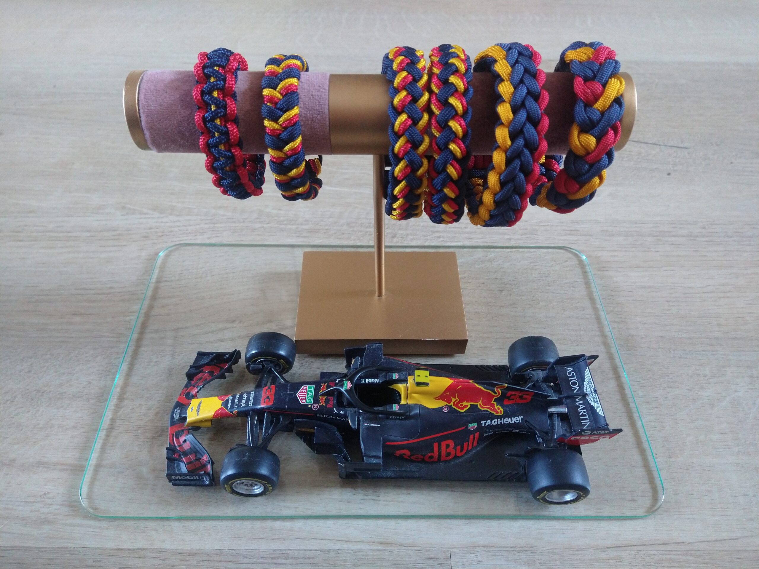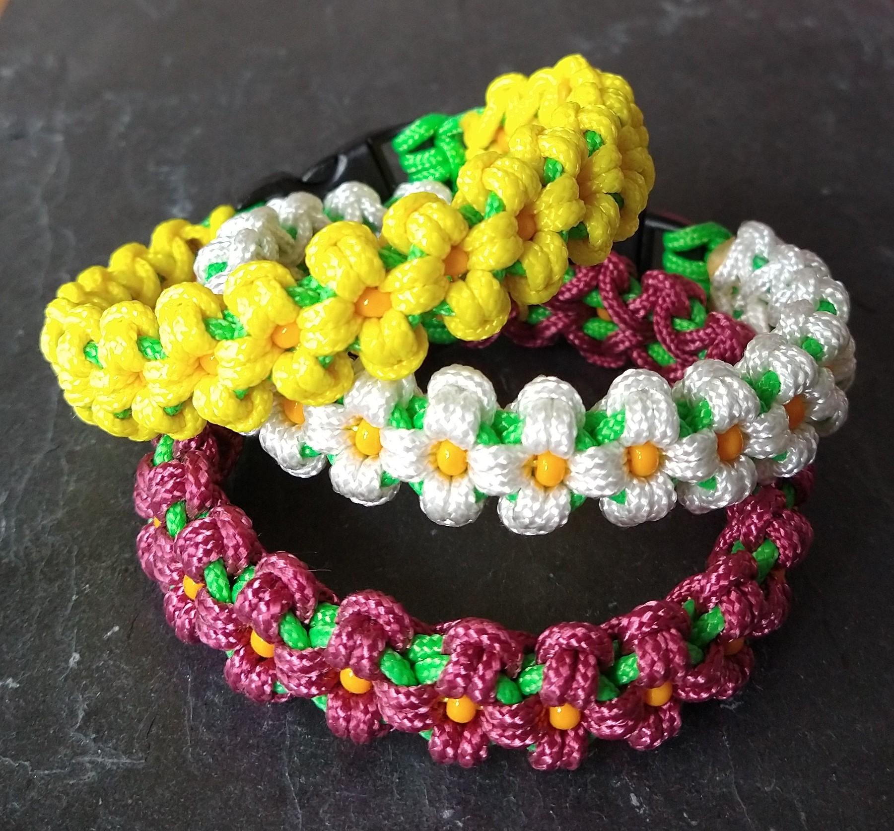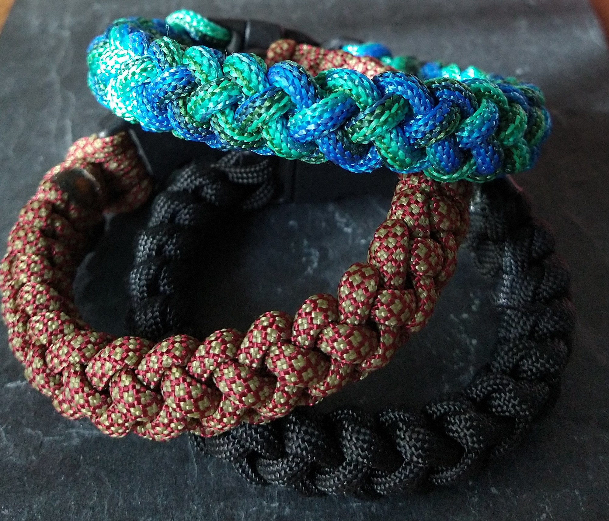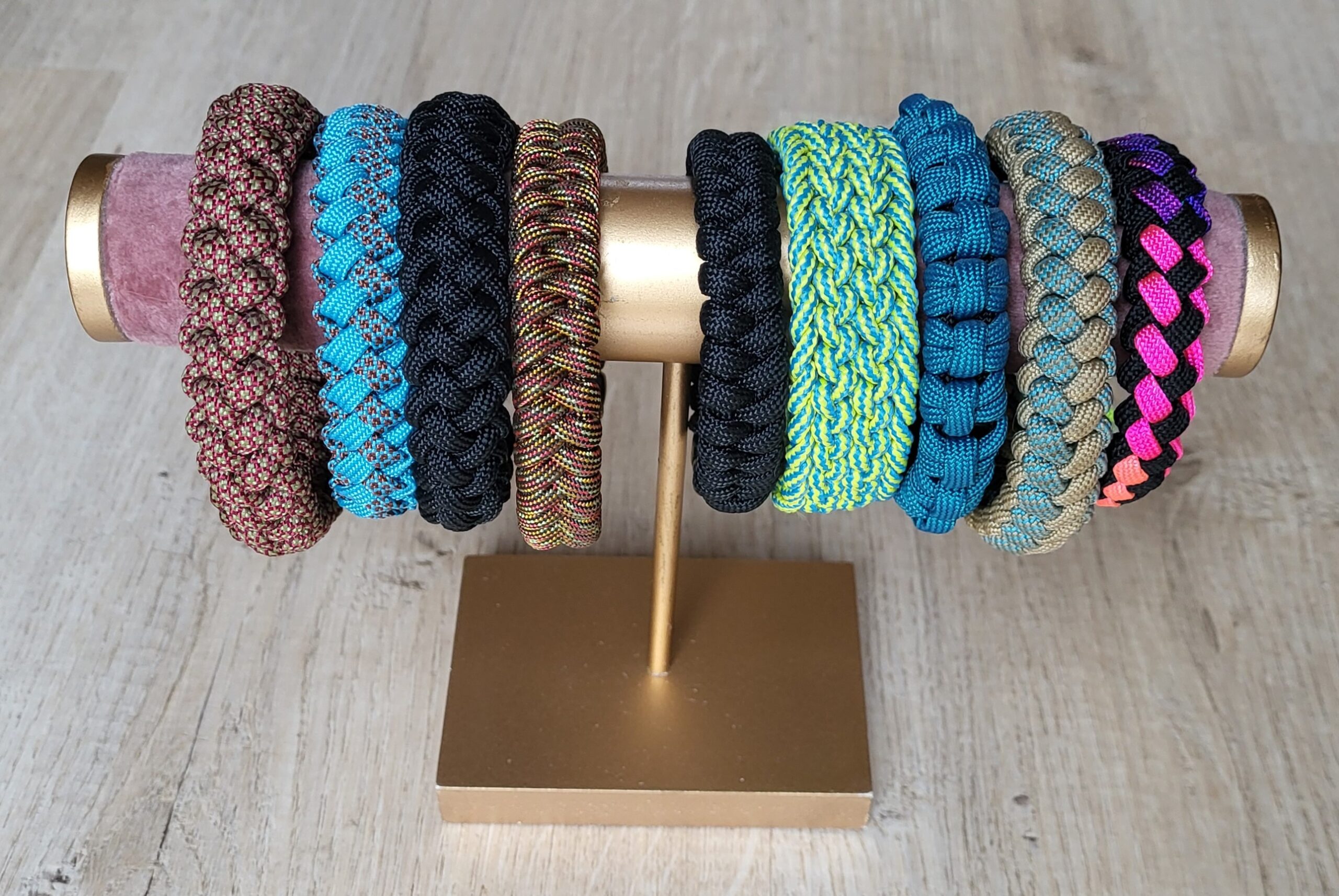De paracord armbanden zijn gemaakt door Yvonne en zijn er in vele kleuren en maten. Ze worden standaard gemaakt met een sterke kunststof buckle. Tegen een meerprijs is het mogelijk een metalen sluiting te kiezen. Op de foto ziet u de display met alle knoopmogelijkheden. Als u een armband mooi vind neem gerust contact op dan maken we hem voor u.