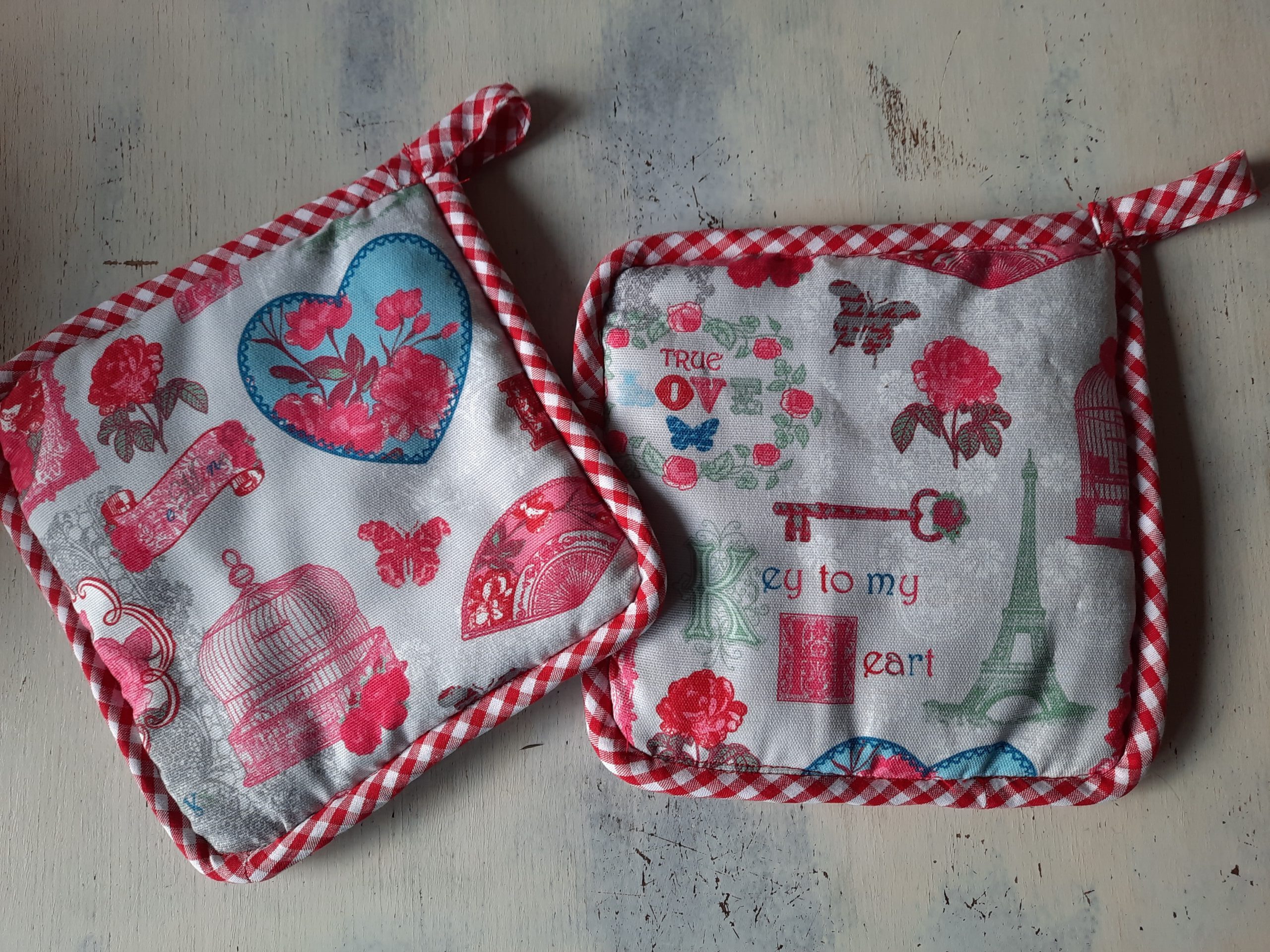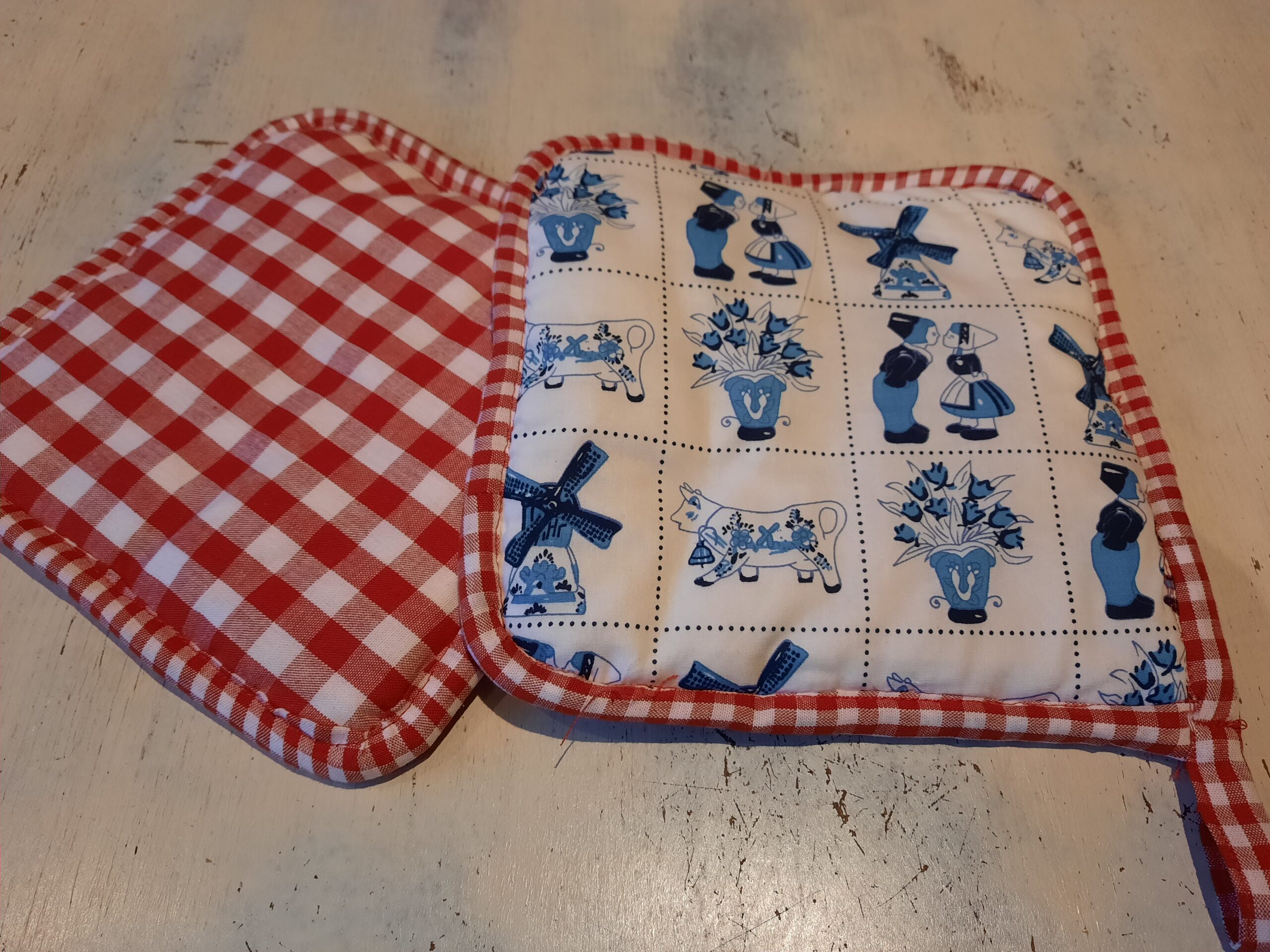 De maat van de pannenlappen is 20×20 cm. Mocht je ze willen afhalen, dan kan dat in Amersfoort.