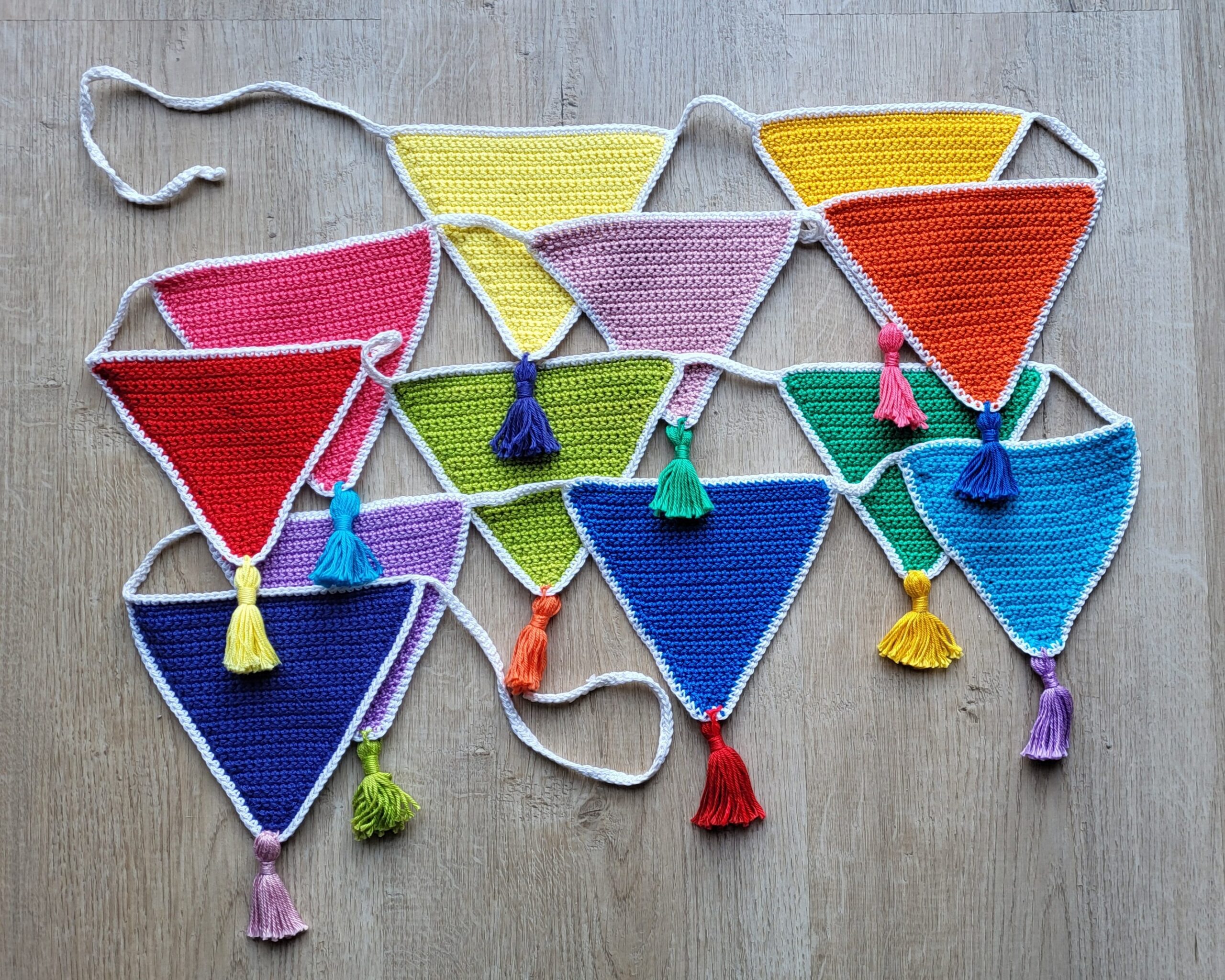 Feestelijke vlaggenlijn met twaalf vlaggetjes in heldere kleuren versierd met een kwastje.